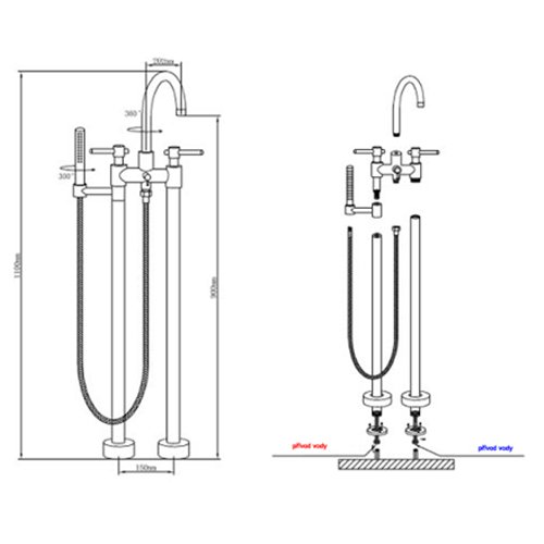 Batéria vaňová voľne stojace stĺpová s ručnou sprchou Hmotnosť: 25kg Celková výška batérie vrátane podstavca a ručné sprchy je 1100mm Výška batérie vrátane podstavca po výtokové rameno je 90cm Dĺžka výtokového ramena od stredu batérie po stred výtoku je 202mm. Batéria je vybavená zo spodnej strany základní labkami pre uchytenie k podlahe za pomocou hmoždiniek. Súčasťou balenia sú pripojovacie nerezové hadice na teplú a studenú vodu. Rozstup batérie je 150mm Sprchová hadica má dĺžku 1500mm