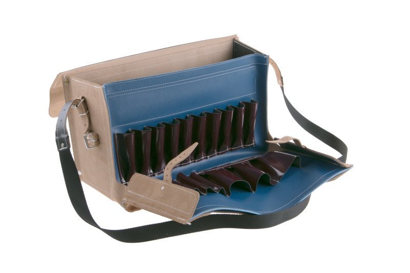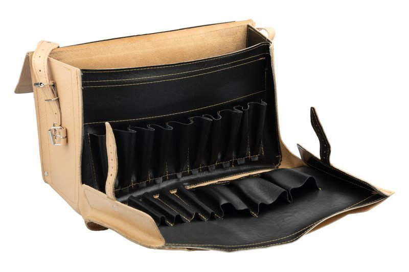 Elektrikářská brašna rozkládací z přírodní usně. Otevírací čelní strana s kapsičkami pro přehledné uložení nářadí a velkou kapsou na výkresy. Výztuha dna, boků a zadní kapsy pro další nářadí. Ideální pro zámečníky, seřizovače atd. Brašna je ušita speciální PES nití Amann, nosnost nitě je 12 kilo, švy jsou v exponovaných místech ještě nýtovány. Prvky: výklopná přední strana brašny, držadlo, popruh přes rameno, ocelová výztuha hřbetu. Vnitřní konstrukce: 1 plochá kapsa na dokumenty, příčka v hlavním úložném prostoru, přihrádky na šroubováky a drobné nářadí ve dvou řadách. Výztuhy: dno, hřbet, boky brašny, vnitřní kapsa. Hlavní materiál: přírodní hovězinová useň.