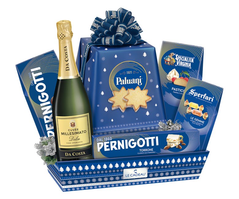 Luxusný darčekový kôš plný talianskych sladkostí a jemne sladkého šumivého vína, zabalený s eleganciou a štýlom. Ideálny darček pre tých, ktorí chcú potešiť blízkych či obchodných partnerov autentickými chuťami Talianska.