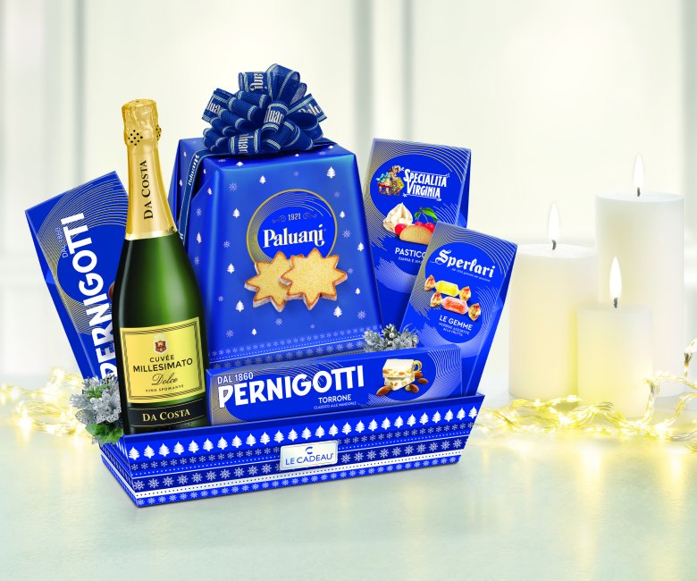 Kôš "Blu Cobalto" od Il Rovere spája taliansky štýl, sladké delikatesy a šumivé víno v elegantnom balení. Tento exkluzívny darčekový kôš na hodvábne potlačenom podnose ponúka starostlivo vybrané produkty, ktoré prinášajú autentické chute Talianska.