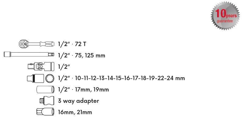 Kvalitní gola sada je vhodná díky kvalitě použitých materiálů a zpracování v profesionální autodílně nebo servisu. 10 let záruka. Všechny části jsou vyrobeny z vysoce kvalitní chrom-vanadiové oceli. Niklová povrchová úprava. Hroty bitů jsou ze slitiny oceli S2. Ráčny mají jemné dělení 72 zubů, tělo ráčny z CrV oceli, zubový mechanismus z S2 oceli, ergonomicky tvarovanou rukojeť se zdravotně nezávadnou gumou. Nový design plastového kufru z primárního materiálu s kovovými uzávěry a panty víka.