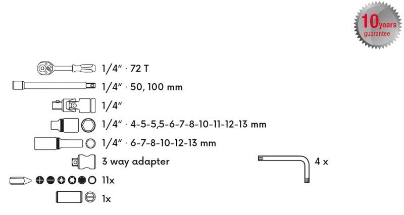 Kvalitní gola sada je vhodná díky kvalitě použitých materiálů a zpracování v profesionální autodílně nebo servisu. 10 let záruka. Všechny části jsou vyrobeny z vysoce kvalitní chrom-vanadiové oceli. Niklová povrchová úprava. Hroty bitů jsou ze slitiny oceli S2. Ráčny mají jemné dělení 72 zubů, tělo ráčny z CrV oceli, zubový mechanismus z S2 oceli, ergonomicky tvarovanou rukojeť se zdravotně nezávadnou gumou. Nový design plastového kufru z primárního materiálu s kovovými uzávěry a panty víka.