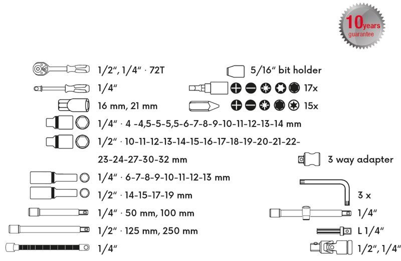 Kvalitní gola sada je vhodná díky kvalitě použitých materiálů a zpracování v profesionální autodílně nebo servisu. 10 let záruka. Všechny části jsou vyrobeny z vysoce kvalitní chrom-vanadiové oceli. Niklová povrchová úprava. Hroty bitů jsou ze slitiny oceli S2. Ráčny mají jemné dělení 72 zubů, tělo ráčny z CrV oceli, zubový mechanismus z S2 oceli, ergonomicky tvarovanou rukojeť se zdravotně nezávadnou gumou. Nový design plastového kufru z primárního materiálu s kovovými uzávěry a panty víka.