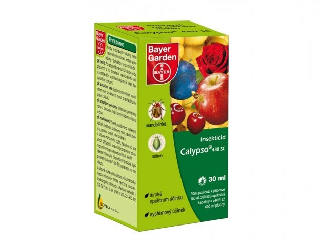 Postřikový insekticidní přípravek ve formě suspenzního koncentrátu pro ředění vodou k ochraně jabloní, třešní, višní, slivoní a brambor proti žravým škůdcům - použití :~Brambory - Mandelinka bramborová - 1-1,5 ml / 3-5 l / 100 m2, OL=21 dní, duben-srpe