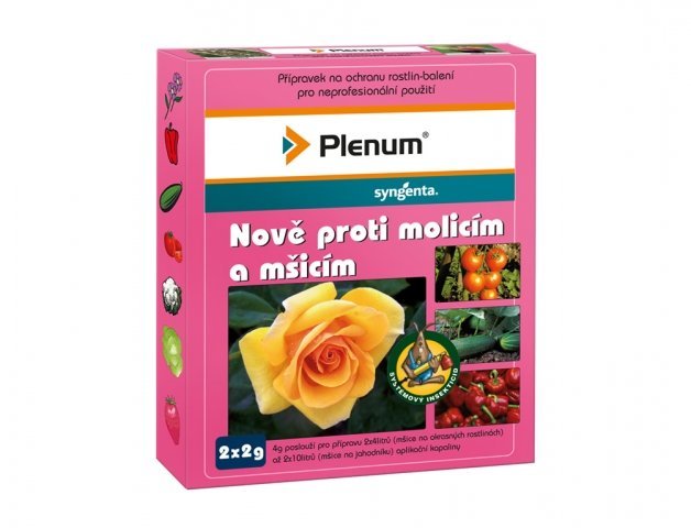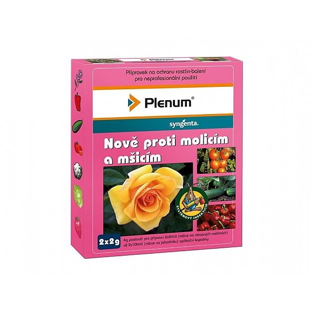 Plenum 2x2g L č.4595-5Postřikový insekticidní přípravek určený k hubení mšic na bramborách, celeru, jahodníku, kapusty, květáku, salátu, aj. a k hubení mšic a molic na okrasných rostlinách, okurkách, paprikách, rajčatech, aj. Balení: 2 x 2 g.