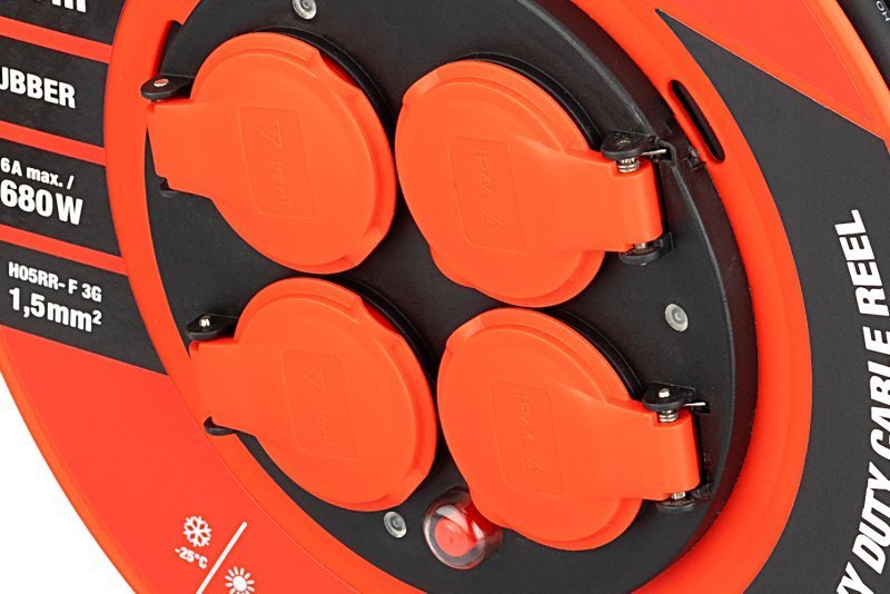 prodlužovací kabel na bubnu se 4mi zásuvkami 3 x 1,5 mm na 230 V, pro venkovní použití
