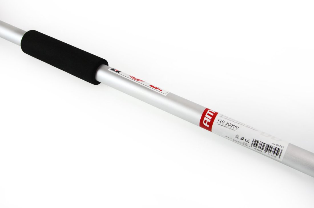 Pevná teleskopická kefa s hliníkovou rukoväťou, dĺžkovo nastaviteľná od 120 do 200 cm.