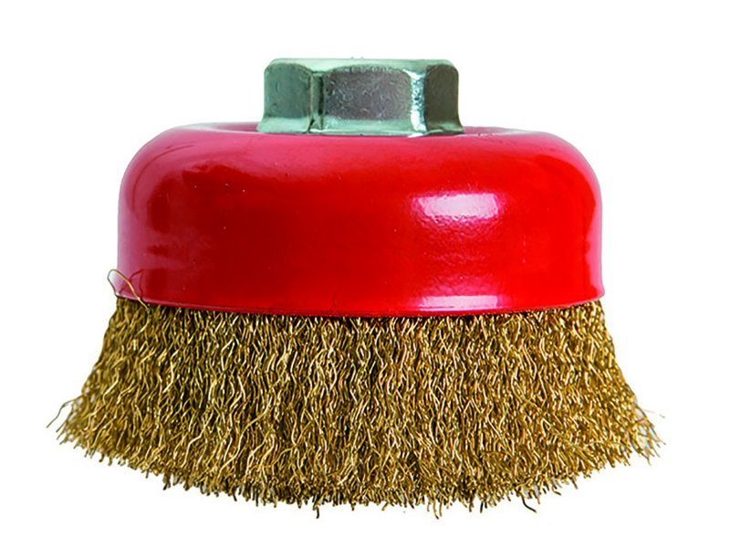 Kartáč miskový s mosaznými vlnitými drátky, uchycení M14, hrnkový, vhodné pro nerezové materiály. Instruktážní video