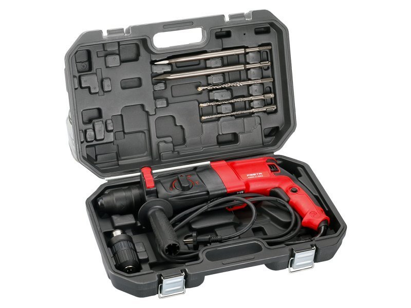 kladivo je dodáváno v praktickém kufru včetně příslušenství - vrtáky SDS+ 6. 8, 10 x 160 mm, sekáče SDS+ plochý 20 x 250 mm a špičák 250 mm, rychlovyměnitelné sklíčidlo na vrtáky s válcovou stopkou 2 - 13 mm, hloubkový doraz, náhradní uhlíky (samostatně objednatelné pod číslem 28223)