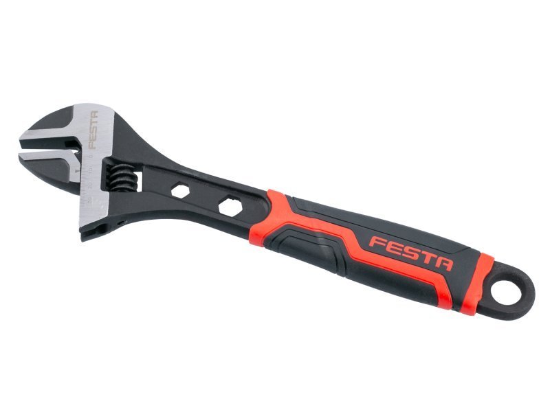 stavitelný klíč FESTA 300 mm (12") kvalitní chromvanadiová ocel orientační milimetrová stupnice na pevné čelisti - nastavení rozsahu pro matice a šrouby max. 38 mm, přesný posuv a nastavení požadovaného rozměru ergonomická rukojeť z měkčené gumy pro pevný a neklouzavý úchop, očko pro zavěšení
