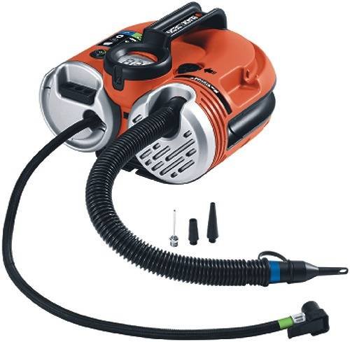Kompresor 12V Black&Decker ASI500Široké spektrum použití nabízí kompresor ASI500 s max. tlakem 11 baru, vhodný pro automobily, motocykly, jízdních a horských bicyklu a i při nafukování fotbalových a jiných míčů, matrací a gumových hraček.Napájení: 12 VMaximální tlak: 11 barPrutok vzduchu: 13 l/minHmotnost: 3,7 kgTlak 11 bar umožňuje široké spektrum činností spojených s nafukováním a huštěním.Digitální ukazatel pomuže nastavit a sledovat požadovanou hodnotu tlaku, aby nedošlo k překročení limitních hranic.Automatické vypnutí eliminuje riziko podhuštění nebo naopak nedohuštění.Dvě možnosti nastavení tlaku huštění:Nízkotlaké pro foukání matrací nebo elunu.Vysokotlaké pro jízdní kola nebo pneu vozidla.Bezkabelové/ aku provedení umožňuje použití kdykoliv a v jakékoliv situaci.Světelný display je ideální při nouzovém použití v nočních hodinách.Kabel i hadice se elegantně uschovají přímo u přístroje.Umístění příslušenství přímo u přístroje snižuje riziko jeho ztráty.