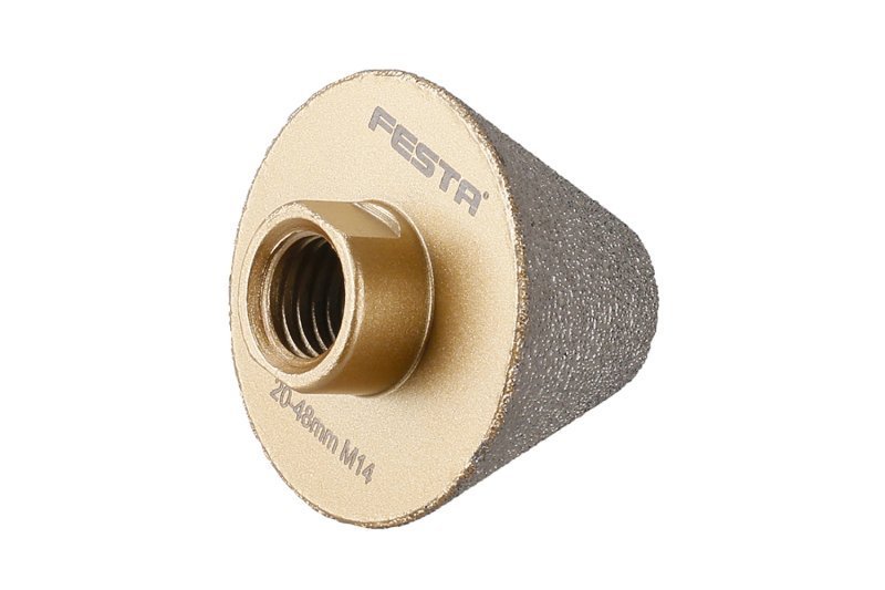profesionální brusná diamantová korunka se závitem M14 - pro úhlové brusky kuželový tvar pro rychlé zabroušení - začištění vykroužených otvorů nebo zvětšení vykroužených otvorů na potřebný průměr pro "suché" broušení kamene, dlažby, obkladů, žuly, mramoru a jiných extrémně tvrdých materiálů nejen ve stavebnictví doporučený pracovní postup - našroubujte korunku přímo na závit hlavy úhlové brusky, pevně dotáhněte - vhodné na zabrušování hran, úpravy vnitřních otvorů v dlažbě, atd... Instruktážní video