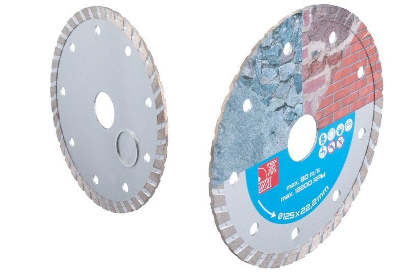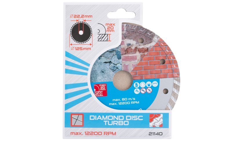Diamantový kotouč DIAMANT turbo, určený pro suché řezání betonu, cihel, zdiva, kamene, vysoce efektivní řezání a rychlé díky speciální konstrukci pevně uchycených diamantových segmentů k nosnému disku kotouče, vysoký obsah diamantového prachu, průměr otvoru 22,2 mm. Součástí balení je redukční kroužek z 22,2 na 20 mm.
