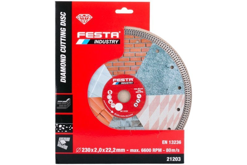 profesionální diamantový turbo kotouč FESTA INDUSTRY - extra tenký jen 2 mm kvalitní diamantová vrstva se speciálním tvarem segmentů a vysokým obsahem diamantového prachu -rychlé a přesné řezání, dlouhá životnost přesné zpracování - napojení na nosný disk kotouče odolávající vysokým teplotám, chladící otvory v těle kotouče pro maximální chlazení kotouče při práci, zesílený střed - vyšší pevnost konstrukce kotouče s nižším přenosem nežádoucích vibrací určený pro mokré i suché řezání dlažby, obkladů, betonu, cihel, zdiva, žuly, mramoru, kamene