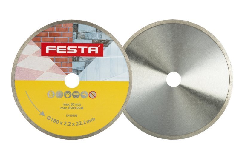 Diamantový kotouč FESTA, určený pro mokré řezání dlažby a obkladů, betonu, cihel, zdiva, žuly, mramoru, kamene, skla, keramiky, kvalitní diamantová vrstva s vysokým obsahem diamantového prachu, kvalitně zpracované napojení na nosný disk kotouče, průměr otvoru 22,2mm