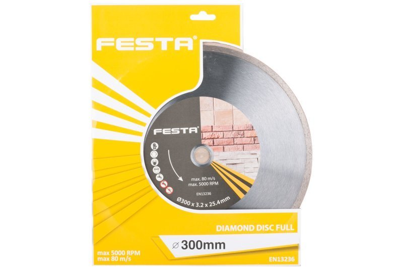 Diamantový kotouč FESTA, určený pro mokré řezání dlažby a obkladů, betonu, cihel, zdiva, žuly, mramoru, kamene, skla, keramiky, kvalitní diamantová vrstva s vysokým obsahem diamantového prachu, kvalitně zpracované napojení na nosný disk kotouče, průměr otvoru 22,2mm