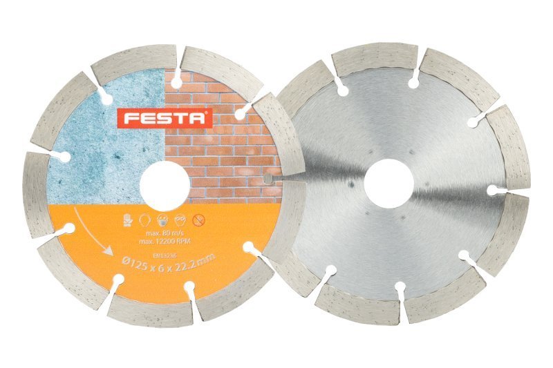 Dvojitý diamantový segmentový kotouč FESTA pro drážkování, 125 x 6 mm, průměr otvoru 22,2 mm, výhodou kotouče je, že lze upnout i do běžné úhlové brusky! Kvalitní diamantové segmenty s vysokým podílem diamantových zrn, segmenty přivařeny laserem k nosnému kotouči vyrobenému z vysoce kvalitní oceli. Díky použitým materiálům i zpracování, nabízí kotouč velmi dlouhou životnost! Použití - pro vyřezání drážek, oddělení stavebních materiálů, odstranění malty... Instruktážní video