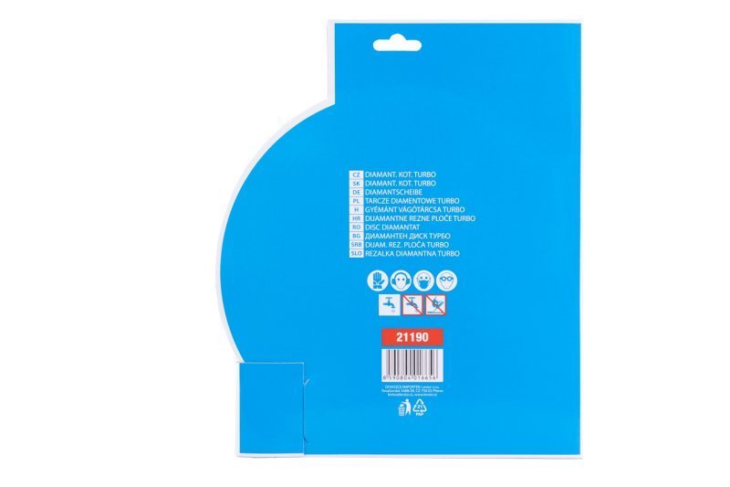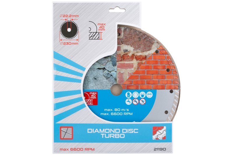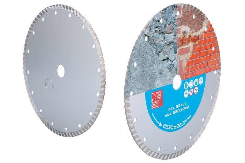 Diamantový kotouč DIAMANT turbo, určený pro suché řezání betonu, cihel, zdiva, kamene, vysoce efektivní řezání a rychlé díky speciální konstrukci pevně uchycených diamantových segmentů k nosnému disku kotouče, vysoký obsah diamantového prachu, průměr otvoru 22,2 mm. Součástí balení je redukční kroužek z 22,2 na 20 mm.