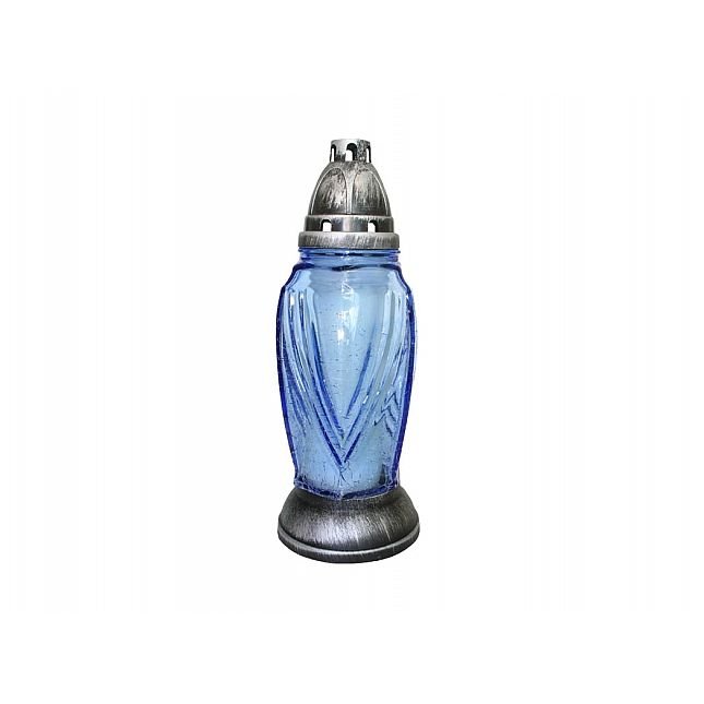 Lampa hřbitovní skleněná KÁPĚ 260g/d11x28cm/plné víčko/modráModerní skleněná průhledná modrá lesklá hřbitovní lampa na svíčky s černo - šedým jakoby škrábaným plastovým kuželovitým víčkem proti dešti a proti uhašení plamínku větrem. Sklo je ve tvaru válce, který se jemně zeširšuje a poté opět zužuje, jsou na něm vylisované kápě a má úmyslně v některých částech popraskaný vzhled. Stojí na širším černo - šedém jakoby škrábaném podstavci, který se postupně zužuje na průměr vlastní lampy. Průměr je 11 cm, výšku 28 cm a váhu 260g. Vhodnou náplní je WP4 ta hoří 96h. Určená k použití na pietní místa.