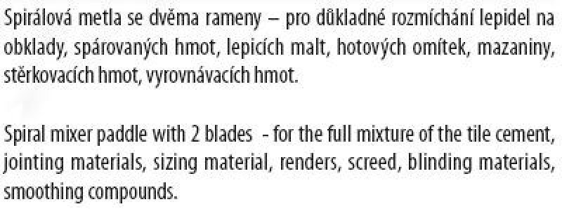 Míchadlo bez kruhu pozinkované O 70 x 500 mm. Spirálová metla se používá pro důkladné rozmíchání lepidel na obklady, spárovaných hmot, lepících malt, hotových omítek, mazaniny, stěrkovacích hmot, vyrovnávacích hmot. Hmotnost 0,307 kg.