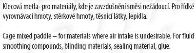 Míchadlo kalich pozinkované O 100 x 500 mm. Klecová metla se používá pro materiály, kde je zavzdušnění směsi nežádoucí. Pro řídké vyrovnávací hmoty, těsnící látky, lepidla. Hmotnost 0,280 kg.