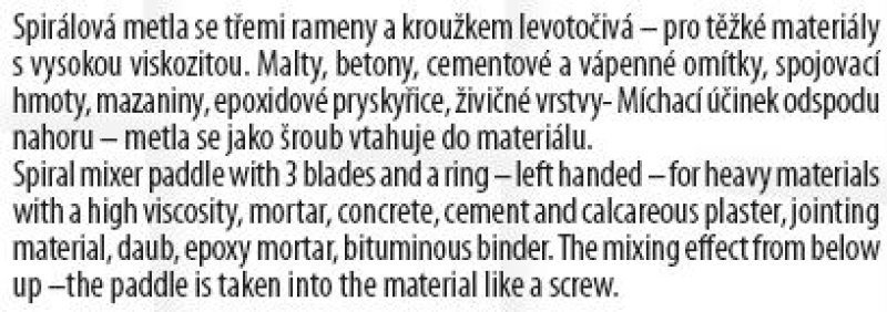 Míchadlo pravotočivé pozinkované M14 O 120 x 600 mm. Spirálová metla se třemi rameny a kroužkem pravotočivá se používá pro těžké materiály s vysokou viskozitou. Malty, betony, cementové a vápenné omítky, spojovací hmoty, mazaniny, epoxidové pryskyřice, živičné vrstvy. Míchací účinek odspodu nahoru - metla se jako šroub vtahuje do materiálu. Hmotnost 1,375 kg.