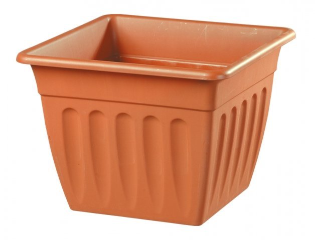 Plastový květník čtvercového půdsorysu v barvě terakoty s vlisovanými obrácenými kapkami, vystouplejším horním límcem zakončeným ohnutím ven. Šířka: 38 cm, výška: 28 cm, hloubka: 38 cm. Vhodnou podmiskou je PRIMAVERA, NG 57738te.