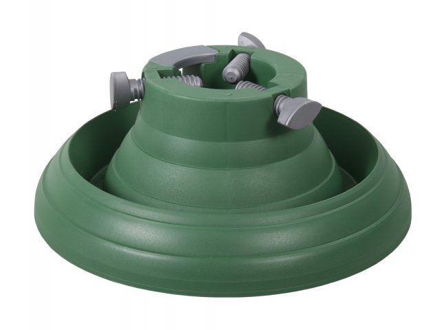Plastový tmavě zelený kruhový stojan pro vánoční stromky. Stojan má širší základnu, která se kónicky zvedne, poté klesne a opět se zvedle, vše probíhá směrem ke středu stojanu. Vznikne tak prostor pro podání výživy a vody vánočnímu stromku. Kmen stromu je umístěn v prostřední části, kde je uchycen a vyrovnán pomocí 3 šroubů. Rozměry: d. 39,7 x v. 14,5cm.