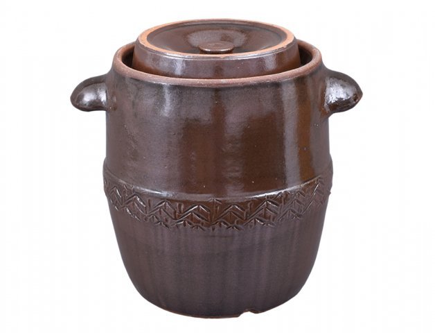 Keramický hnědý lesklý tzv. zelák s víčkem a s uchama. Do něj se nakládá a nechá kysat zelí. Jeho rozměry jsou: d.36 x v.52cm, objem 40l.