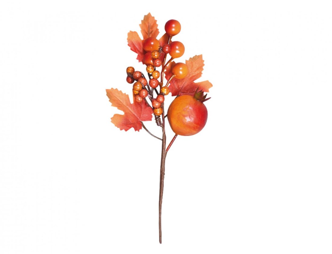 Podzimní větvička v podobě meruzalky je ozdobena oranžovým granátovým jablkem, lístky a bobulemi. Větvička je vhodná na aranžování, do květinových vazeb, při zdobení věnců. Délka: 20 cm.