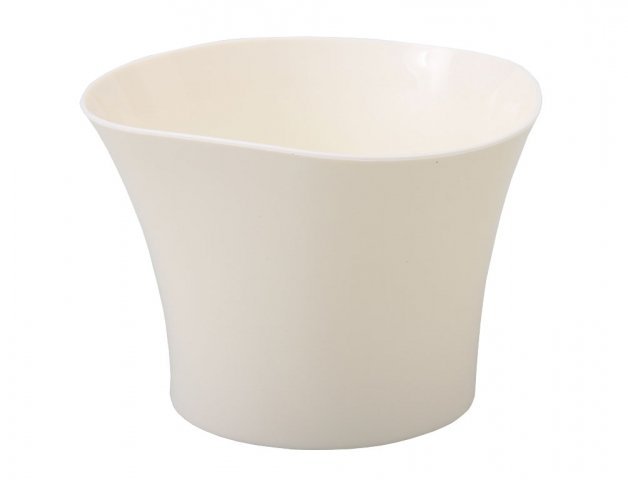 Plastový béžový lesklý obal určený zejména do interiérů pro květníky s petrklíčema. Půdorys má kruhový, směrem vzhůru se stává trojúhelníkový se zaoblenýma hranama. Rozměry: 12 x v. 9cm.