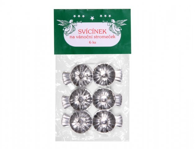 Stříbrný držák svíček na stromeček. Průměr držáku: 3,8 cm. V balení je 6 kusů.