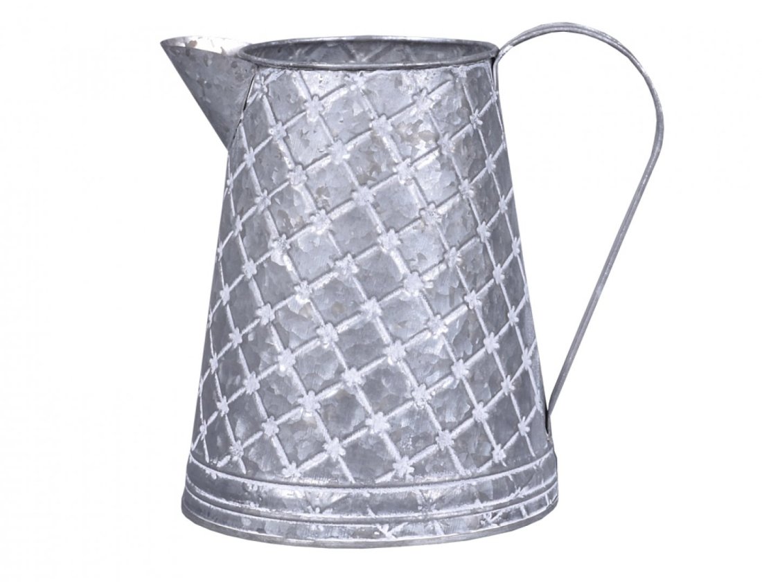 Plechový džbán v cínové barvě s dekorací sítě. Šířka: 21 cm, výška: 19 cm, hloubka: 16 cm.