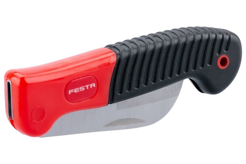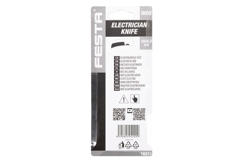 Zavírací elektrikářský nůž se zahnutou čepelí, silná čepel se dvojím ostřím usnadňujícím odizolovávání vodičů, pogumovaná ergonomická rukojeť, blistr.