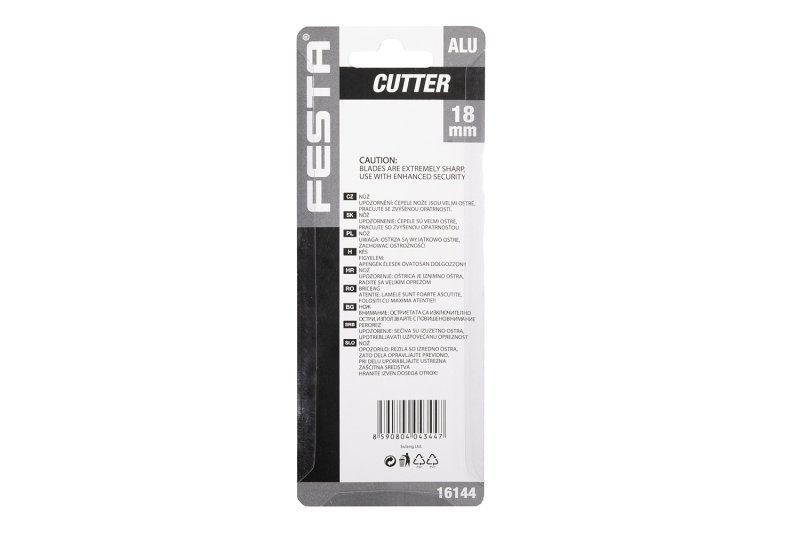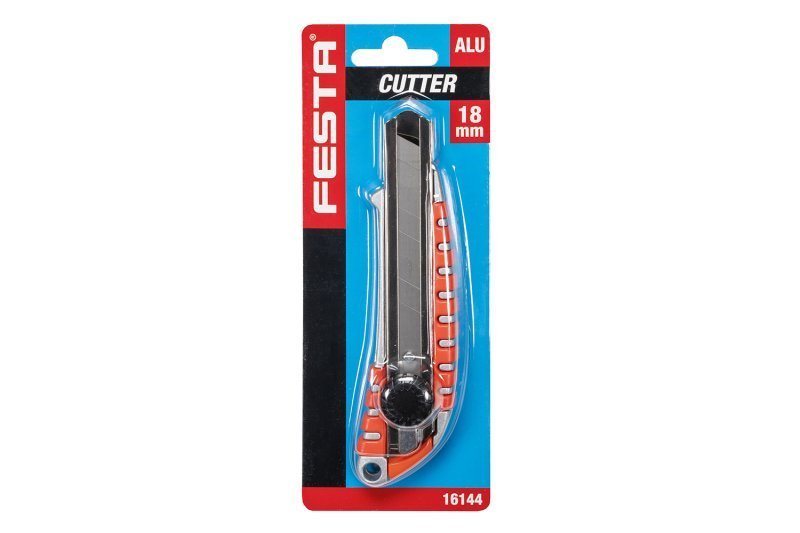 Odlamovací nůž FESTA 18mm, kvalitní materiály, celokovové tělo nože, protiskluzné plastové výstupky, kovová lišta, odolná šroubková aretace, do nože lze umístit až 2 náhradní břity, blistr.