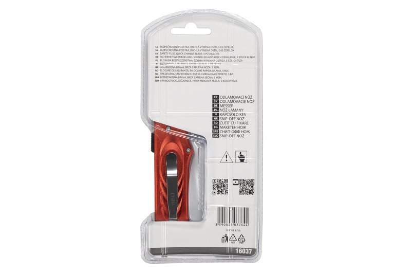 Profesionální celokovový nůž, výsuvná lichoběžníková čepel s aretačním tlačítkem, klip na opasek, 5 náhradních čepelí.