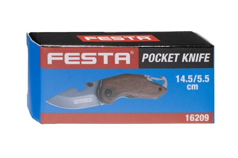 Malý kapesní nůž FESTA, kompatní rozměry, kvalitní čepel i zpracování, ostří zajištěno pojistkou proti zavření, karabina v rukojeti pro zavěšení na klíče, řetizek, atd., v čepeli výsek použitelný jako otvírák na lahve. Baleno v krabičce.