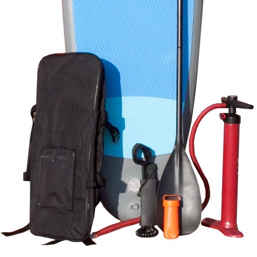 Tento All around SUP paddleboard je vďaka svojej stabilite a ovládateľnosti vhodný pre začiatočníkov i pokročilých. Odporúčame ho predovšetkým do pokojných a mierne tečúcich vôd. Paddleboard je nafukovacie, a preto ho možno veľmi ľahko zložiť do auta a prevážať. Všetky naše paddleboard sú vyrobené z veľmi kvalitného a odolného 2-vrstvového PVC. Tento paddle board má na špici elastickú sieťku, ktorá sa hodí pre upnutie menších predmetov alebo malého batôžku. Paddleboard je opatrený tromi plutvami z ktorých dve postranné sú pevne pripevnené a stredné centrálnej plutva je odnímateľná. Tento paddleboard je ďalej vybavený nerezovým D očkom pre uchytenie bezpečnostné šnúry (leash), ktorá zaistí, aby pri páde paddleboard neodplával. Horná nášľapná strana je potiahnutá protišmykovým materiálom EVA. Ďalej je súčasťou balenia ručná pumpa, bezpečnostné šnúra (leash), sada lepenie na rýchlu opravu a batoh pre ľahký transport sady.