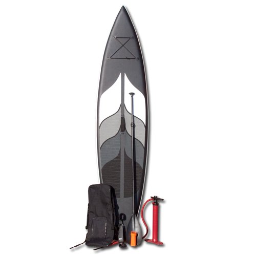 Tento Touring SUP paddleboard je vďaka svojmu tvaru a dĺžke vhodný pre dlhšie a rýchlejšiu jazdu v predovšetkým pokojných a mierne tečúcich vodách. Tento paddleboard je odporúčaný mierne pokročilým až pokročilým jazdcom. Paddleboard je nafukovacie, a preto ho možno veľmi ľahko zložiť do auta a prevážať. Všetky naše paddleboard sú vyrobené z veľmi kvalitného a odolného 2-vrstvového PVC. Tento paddle board má na špici elastickú sieťku, ktorá sa hodí pre upnutie drobných predmetov alebo malého batôžku. Paddleboard je opatrený tromi plutvami z ktorých dve postranné sú pevne pripevnené a stredné centrálnej plutva je odnímateľná. Tento paddleboard je ďalej vybavený nerezovým D očkom pre uchytenie bezpečnostné šnúry (leash), ktorá zaistí, aby pri páde paddleboard neodplával. Horná nášľapná strana je potiahnutá protišmykovým materiálom EVA. Súčasťou balenia je hliníkové pádlo, ktoré na vode pláva a na rozdiel od niektorých iných značiek sa nepotopí. Pádlo je nastaviteľné na dĺžky 175-217cm a váži 1100 g. Ďalej je súčasťou balenia ručná pumpa, bezpečnostné šnúra (leash), sada lepenie na rýchlu opravu a batoh pre ľahký transport sady.