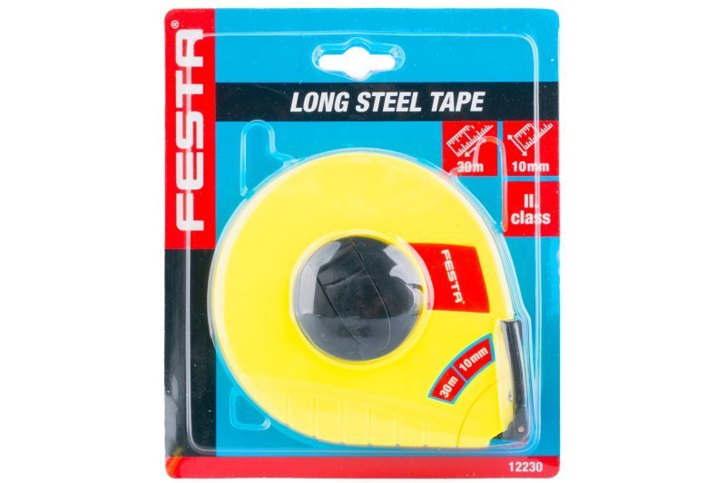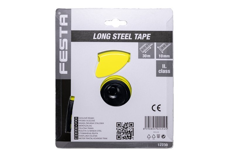 Ocelové pásmo 30m FESTAKvalitní a přesné ocelové pásmo, kalená páska s očkem a výklopným háčkem - snadnější měření, EEC certifikát - vhodné ke kalibraci, sklopná navíjecí ručka s pojistkou, ABS plast - odolnější při nárazech, plastový klip na opasek, baleno na blistru.