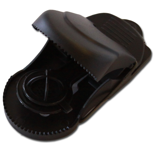 Pružinová plastová pasca na myši s možnosťou uchytenia návnady. Pasca má uzatvárateľný kryt návnady pre ťažšie zjedenie hlodavcom