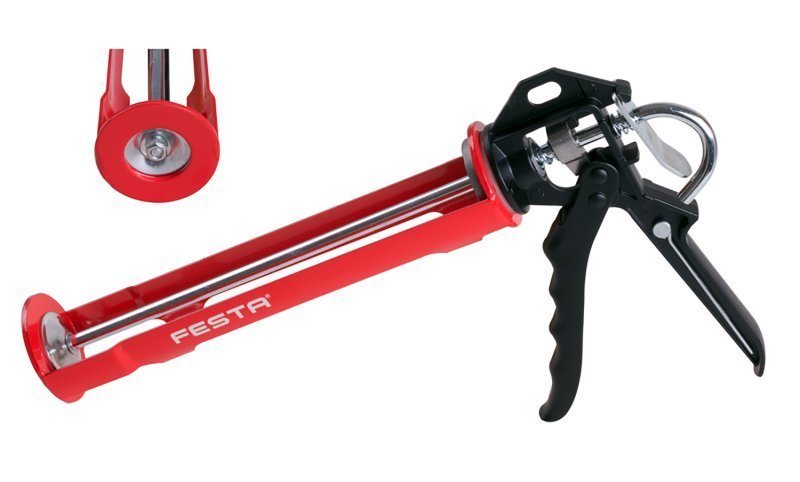 Vytlačovací pistole FESTA, PROFI, kvalitní zesílený a profilovaný ocelový rám i výtlačný a pojezdový mechanismus, uzavřené zakončení rámu pistole, kovová ergonomická rukojeť pro pohodlnou práci, profilované kovové bočnice, trn na čištění zaschlého tmelu ve špičce kartuše, použití : zesílený rám pro extra husté tmely - chemické kotvy a malty, pro vytláčení tmelů a lepidel v kartuších 310 ml.