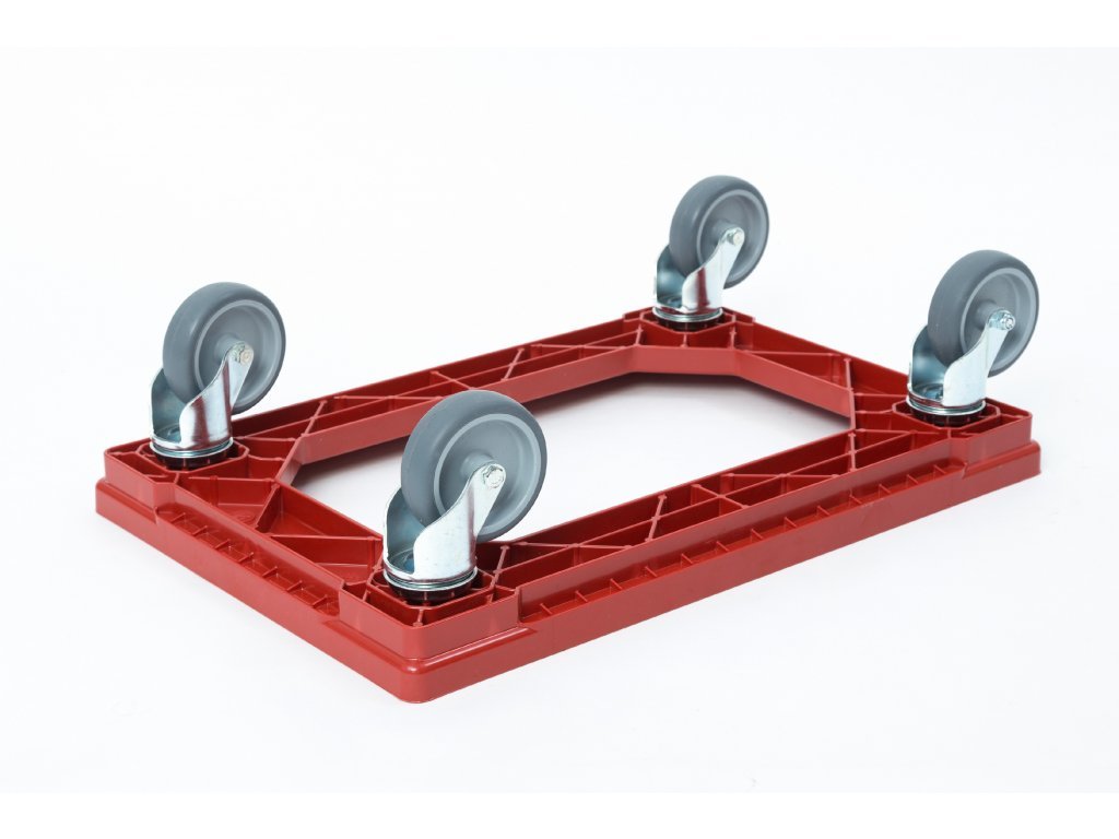 Podvozok pod prepravky vyrobený z materiálu ABS, ktorý umožňuje veľmi ľahkú manipuláciu s prepravkami s rozmermi 600x400 mm alebo dve 400x300 mm. Kvalitný robustný vystužený rám zaručuje, že tieto vozíky sa nelámu a nepraskajú. Vozíky majú nosnosť až 300 kg. Použitá 4x otočné kvalitné gumové kolieska TENTE s priemerom 100 mm, ktoré sú zárukou veľmi tiché manipulácie. ATEST pre styk s potravinami.