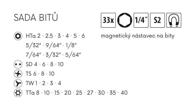 Sada bitů 33ks, S2 (5030), Hta, SD, TW, TS, Tta + magnetický nástavec.