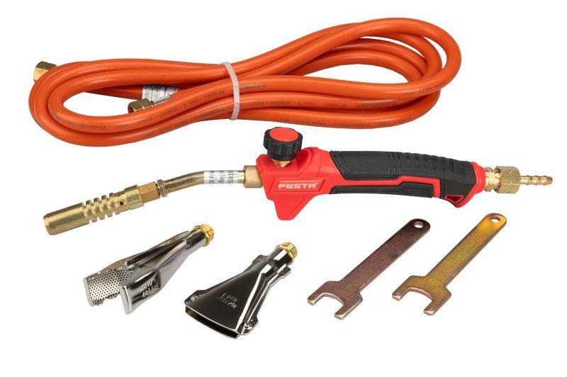 hořák FESTA na propan-butan (LPG), sada s hadicí 3 m hadice s certifikací maximální výkon 2 kW ergonomická neklouzavá rukojeť, plynulá regulace průtoku opalovací a pájecí nástavce vhodné hadice 3 m - 69910 napojení přes uzavírací ventil 69928 na lahve 2 kg