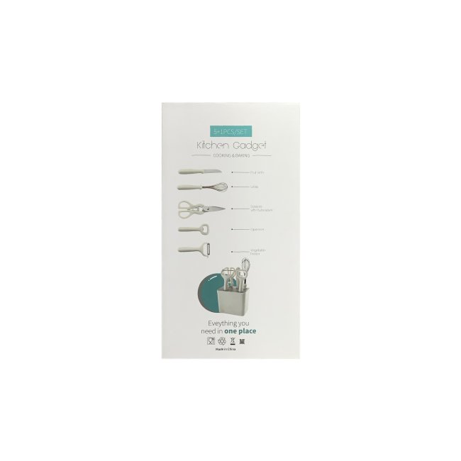 Unikátna sada kuchynského náčinia s praktickým stojanom. Rukoväť je vyrobená z termoplastu a zvyšná časť náčinia je z nerezu. Kuchynská sada vydrží teploty od -30 ° C do 160 ° C. Vhodné na umývanie v umývačke riadu.