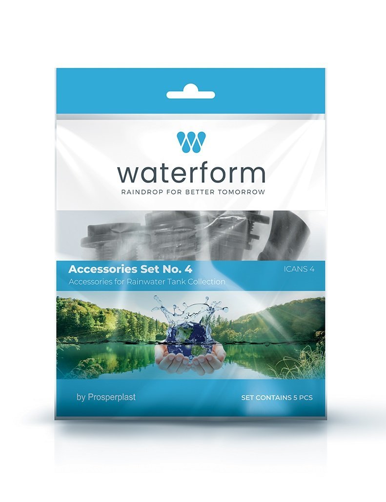 ICANS4 - Systém pro vypouštění dešťové vody ze sudu. Sada obsahuje 5 dílů: kohoutek; přípojku; rychlospojku, koncovku hadice; držák koncovky. Koncovka hadice je kompatibilní se sudy MAZE, SMOOTH, PERUNO a TUBE. Kohoutek je vybaven těsněním a maticí, díky které je kompatibilní se všemi sudy na dešťovou vodu ze sortimentu Waterform.