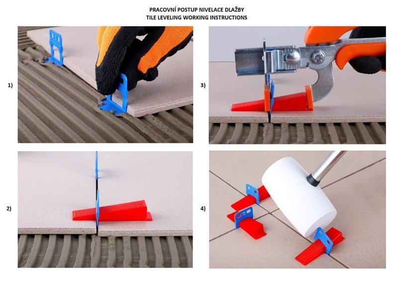 nivelační systém pro přesnou pokládku dlažby a obkladů odstraní případný výškový rozdíl mezi pokládanými dlaždicemi ve spáře nivelační systém obsahuje - distanční spony různých tlouštěk a nivelační klínky (opakovaně použitelné) aplikace - pomocí kleští 37177, 37178 šířka spony udává šířku spáry aplikace klínků pomocí kleští srovná dlaždice, po zaschnutí se horní část spony s klínkem odstraní - bílou gumovou palicí nebo ukopnutím rozměry a množství uvedeny v názvu výrobku