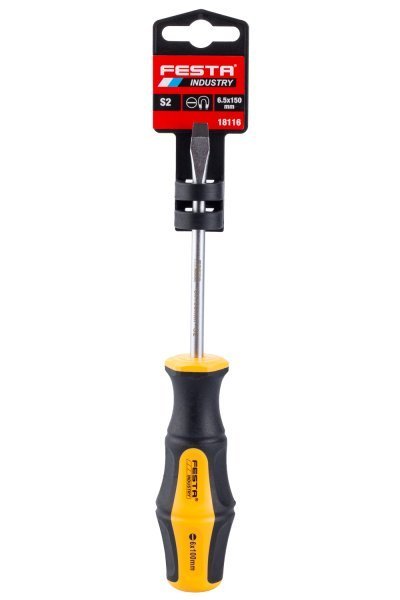 Šroubovák má kovový dřík vyroben z velmi kvalitní chromvanadiové oceli, kalený hrot je magnetický, povrchově chráněný tvrdochromem, kombinace polypropylenu a pryže na ergonomicky tvarované rukojeti zaručuje výborné antiskluzové vlastnosti a dobrou odolnost vůči mazadlům a chemikáliím.