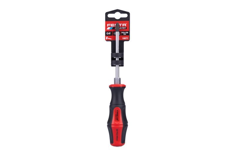 Úderový šroubovák se šestihranem pro maticový klíč a s dříkem z odolné chrom-vanadiové oceli procházejícím celou rukojetí. Ergonomicky tvarovaná rukojeť. Zakončení šestihrenného dříku procházejícího celou rukojetí je možné použít jako úderovou plochu pro kladivo nebo povolování a utahování pomocí klíče nebo ráčny. Magnetická špička šroubováku.
